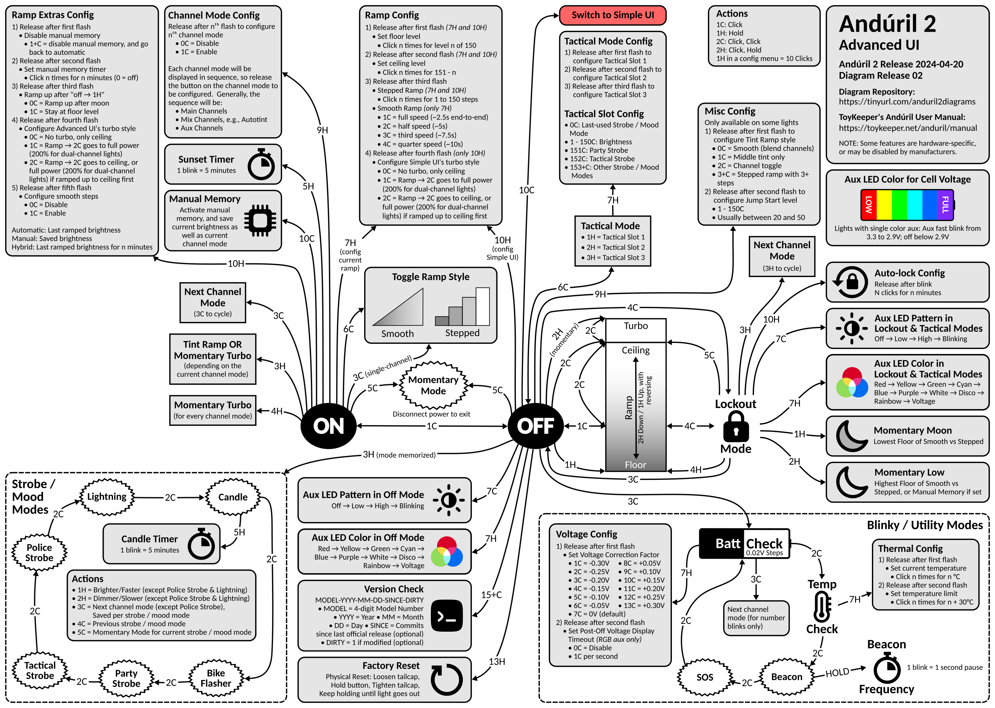 Even when you’re following the flowchart, Anduril isn’t exactly user friendly. It’s very easy to lose track of the light’s state while moving between different modes and configuration menus. I wish there was say a Bluetooth app you could use for setting configuration, then the button pushes could be solely for flashlight actions.